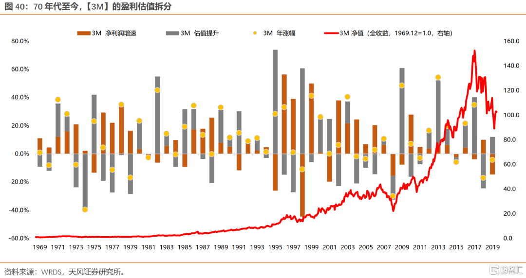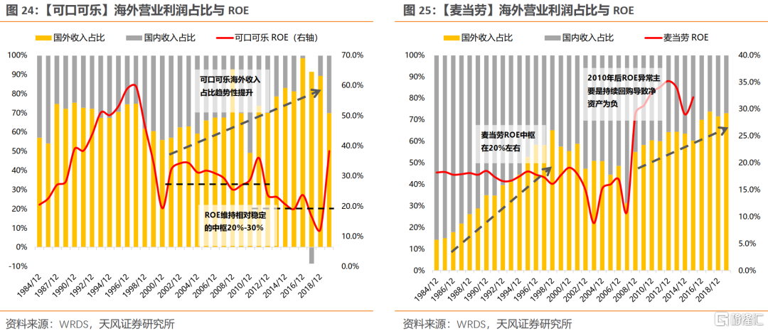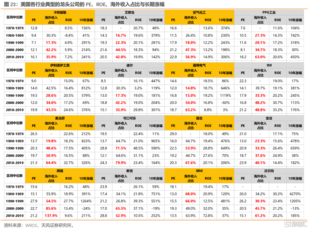(3)第三级跨越:90S-00S全球化的扩张。90年代以来,全球化扩张的步伐,是支撑美股各行业龙头盈利和股价再上台阶的关键(各行业龙头ROE中枢都稳定在20%左右,不论是消费、科技,还是制造)。事实上到了2010年之后,部分公司开始了第四级跨越,即通过持续回购来维持高ROE,比如麦当劳、3M。