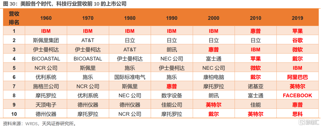 (1)IBM:涨幅也主要集中在80年代和90年代,分别上涨了+120%、+481%;而在00年代和10年代,仅上涨了+35%、+37%。科技技术的创新与更迭也令科技企业延续辉煌难度加大。PC时代的IBM、思科,两者都在随后的科技浪潮中逐步暗淡。