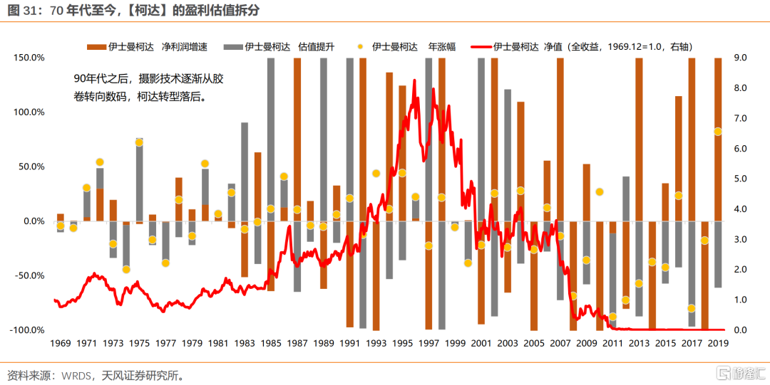 (2)柯达:柯达的倒闭凸显了科技技术路线变迁所带来的颠覆性变化。依赖于科技创新、产品不断升级换代的企业,其永续增长能力,要弱于必需消费品公司。