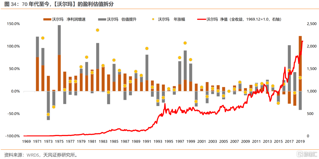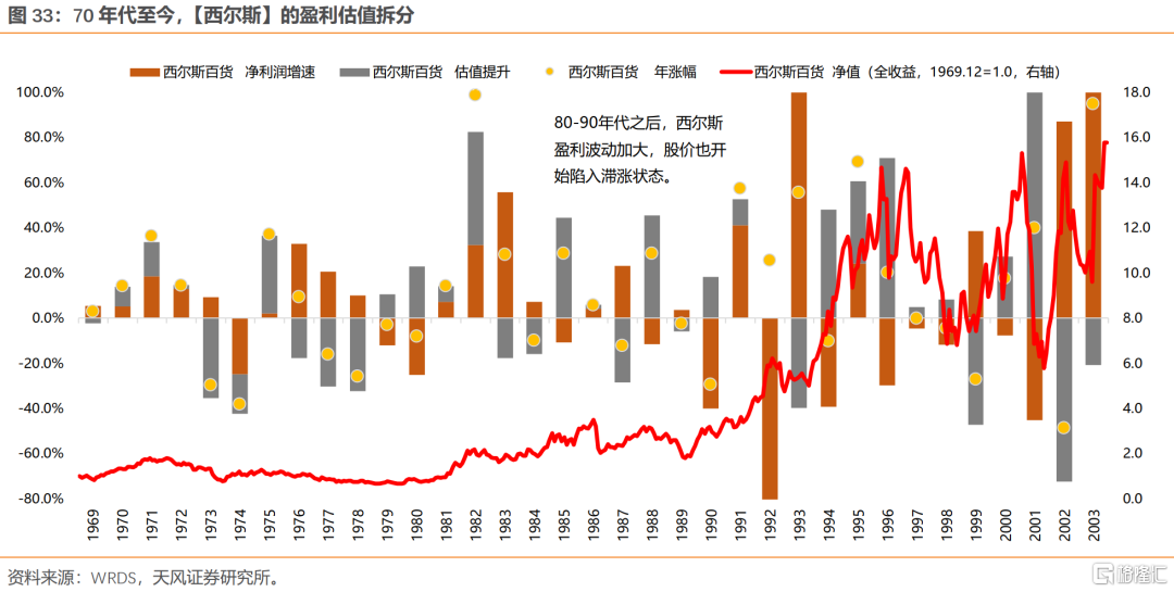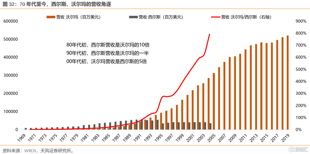 (3)西尔斯:背后反映的是美国百货业的百年“混战”,核心在于消费者结构、收入、需求等的变化。靠商业模式创新,或者消费需求随时代不断更迭的行业,永续增长能力较弱。80年代初,西尔斯营收是沃尔玛的10倍;90年代初,西尔斯营收是沃尔玛的一半;00年代初,沃尔玛营收是西尔斯的5倍。