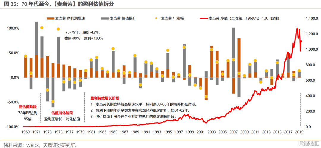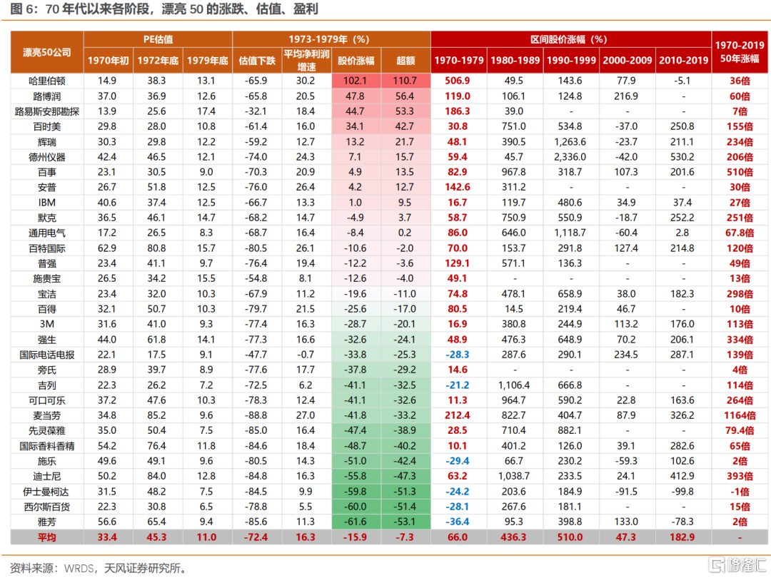 2、“漂亮50”起落:缘于经济持续增长和消费繁荣(分子驱动),阶段破灭于利率的大幅攀升(分母压制),而估值消化主要靠盈利的持续增长。