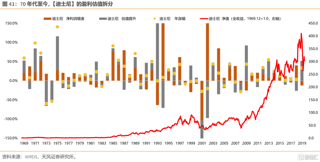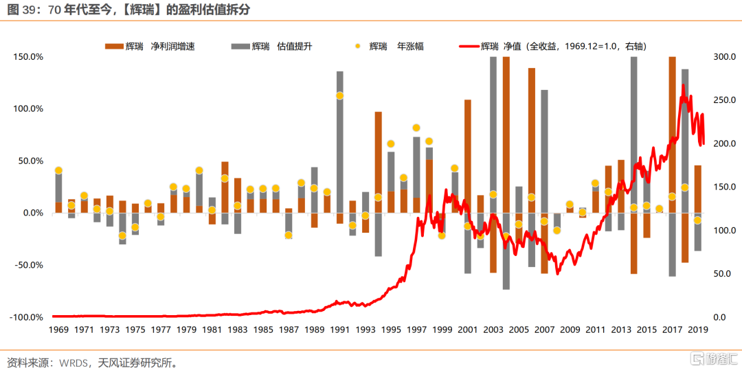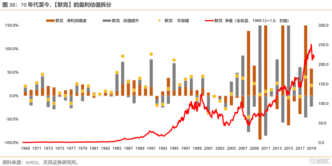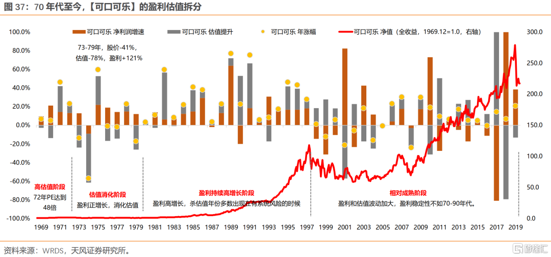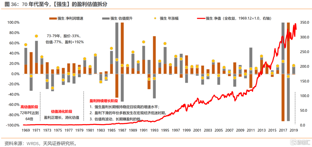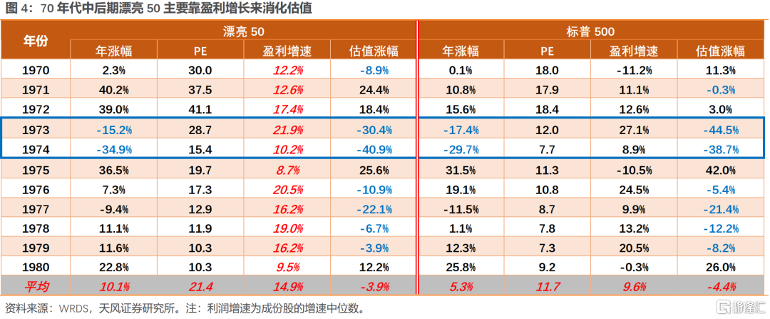 拉长整个70年代来看,除去1973-1974年有系统性风险的两年,其余年份,漂亮50主要靠盈利持续的高增长来消化估值。