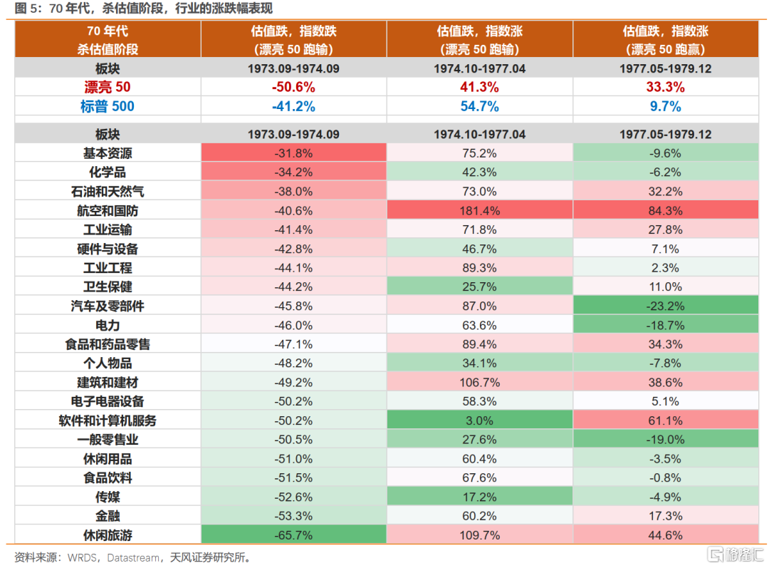 ③ 在漂亮50杀估值阶段,表现抗跌的行业都是受益于战争(航空、国防),以及油价上涨的行业(基本资源、化学品、石油和天然气);跌幅较大的公司是盈利增速较低,或70年代初估值大幅透支的公司。