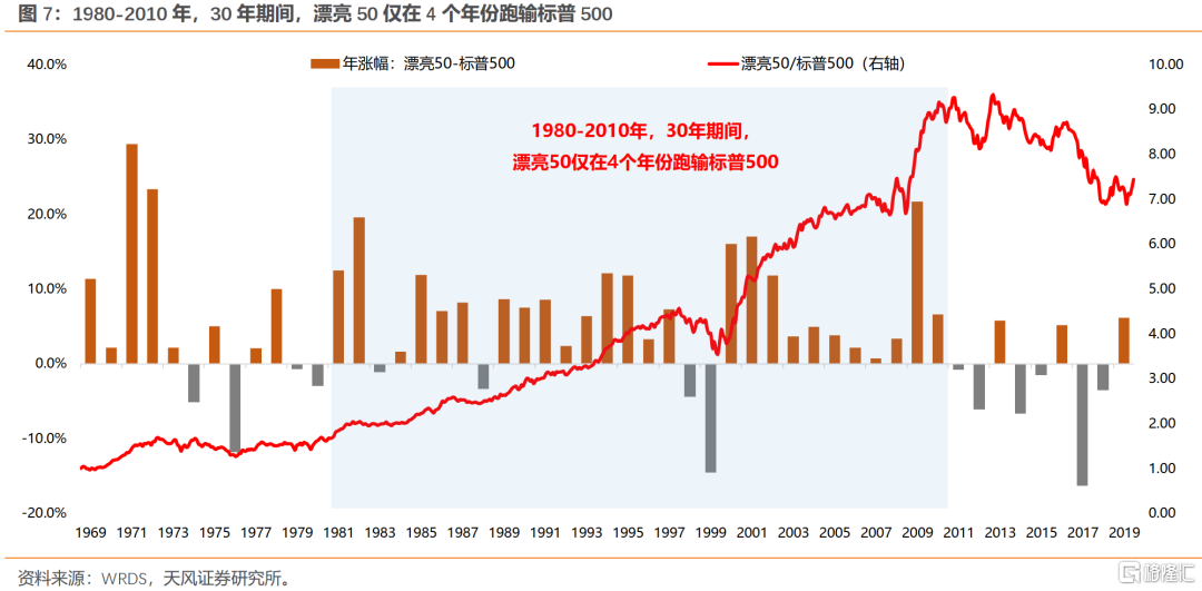 ② 70年代后期开始,“漂亮50”连续30多年跑赢标普500指数;