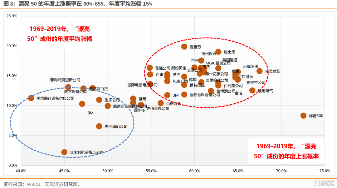 1969-2019年,漂亮50中,多数公司的年度上涨概率分布在60%-65%,年度平均涨幅在15%左右。事实上,绝大部分公司的年度上涨概率都小于标普500指数,但长期能够大幅跑赢标普500指数,主要是因为多数优质公司的涨幅弹性更大。