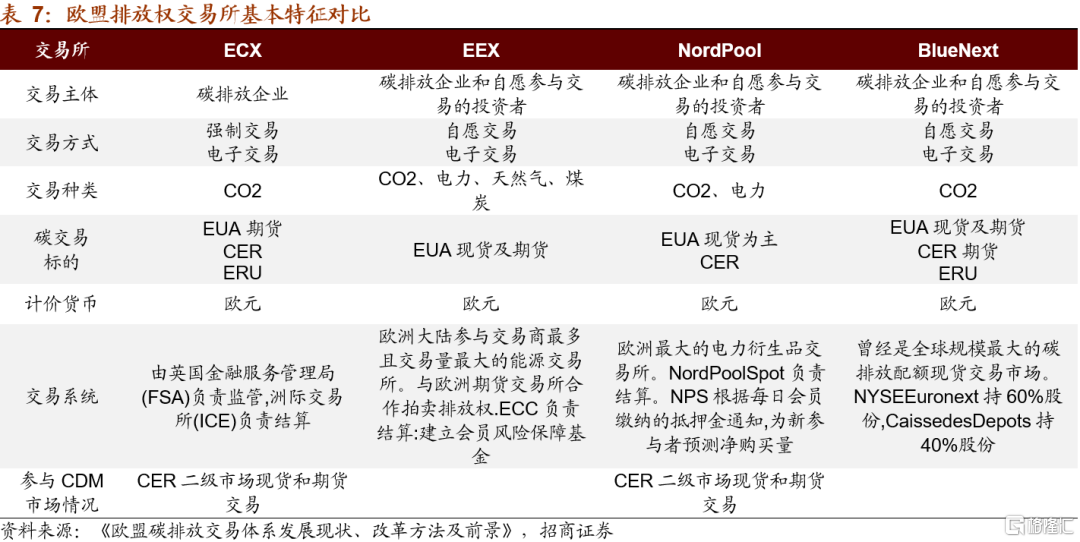 碳排放权交易基本都是通过直接交易市场或者交易所来实现。欧洲排放权交易体系主要有巴黎BlueNext碳交易市场、荷兰Climex交易所、奥地利能源交易所(EXAA)、欧洲气候交易所(ECX)、欧洲能源交易所(EEX)、意大利电力交易所(IPEX)、伦敦能源经纪协会(LEBA)和北欧电力交易所(NordPool)等交易中心。其中ECX、EEX、Nordpool和BlueNext四个交易所规模和影响范围较大。