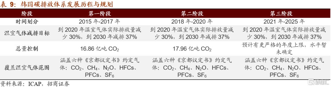 韩国碳交易制度采用“总量控制”的模式,同时允许配额的储存和预借,目前设定了三个承诺期:
