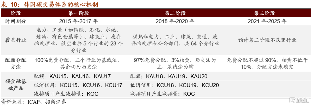 分行业的配额分配方法:韩国的碳配额分配方法有历史法(祖父法)和基准线法两种。第一阶段23个行业中除了水泥、炼油和航空业使用基准线法外,其余均为历史法。原计划为第二阶段开始逐渐增加基准线的行业,实际情况是暂未增加。