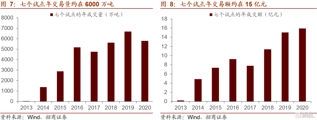 2011年10月,国家发改委发布《碳排放权交易试点工作通知》,确立了两省五市(北京市、天津市、上海市、重庆市、深圳市、广东省、湖北省)共7个国内碳排放权交易试点。2013年,试点交易开始进行。