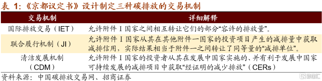 各国获得的碳排放权若未用完的部分是可以出售的,《京都议定书》设计制定三种碳排放的交易机制,分别为国际排放贸易(InternationalEmissionTrade,简称IET)、联合履行(JointImplement,简称JI)和清洁发展机制(CleanDevelopmentMechanism,简称CDM),这三种碳交易机制就形成了碳排放权交易体系的雏形。