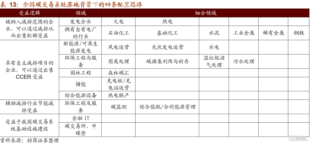 建议关注四大方向:(1)碳交易与碳登记结算等基础设施。(2)碳监测、协助减排。(3)出售CCERs。主要包括可再生能源(风电、光伏、水电、生物质能等)、垃圾焚烧与填埋、湿垃圾沼气处理、CCS(碳捕集与储存)、林业碳汇以及电动汽车的充电站/充电桩运营。(4)出售碳排放配额。碳排放低于行业标准的电力公司,以及后续被纳入减排范围的行业内,单位产品碳排放较低的公司。