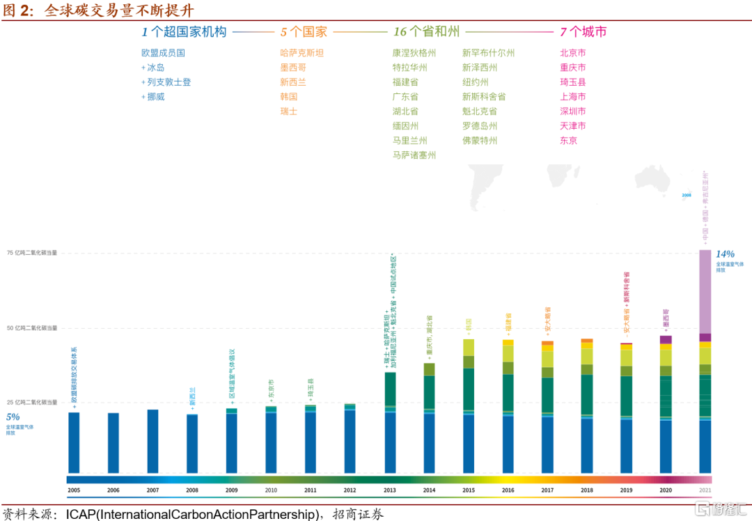 从2005年《京都议定书》生效,欧盟碳排放权交易体系建立以来,至今全球已共有29个碳交易所。它们按照管辖区域被划分为“1个超国家机构,5个国家,16个省和州,7个城市”。自2005年以来,全球碳交易量和碳交易市场所覆盖的排放量都在不断提升,最初仅有欧盟碳排放交易市场覆盖了5%全球温室气体排放量,至2020年已覆盖9%。随着中国全国碳市场的建立,预计全球碳市场在2021年覆盖的温室气体排放可升至全球总量的14%,对应约75亿吨二氧化碳当量。