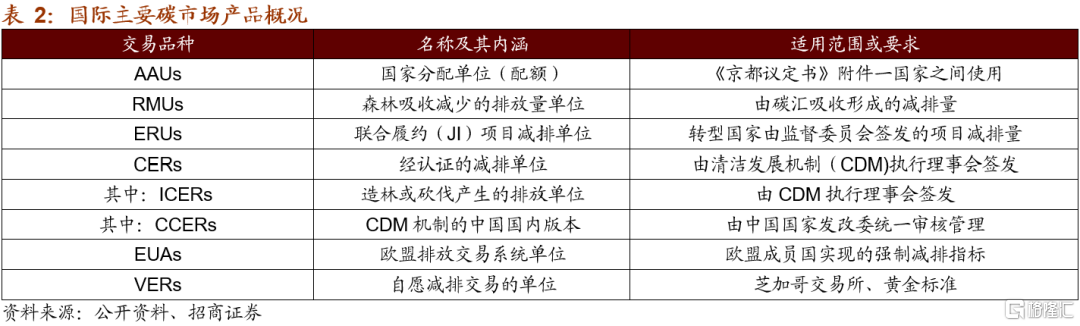 碳交易即把二氧化碳排放权作为一种商品,买方通过向卖方支付一定金额从而获得一定数量的二氧化碳排放权,从而形成了二氧化碳排放权的交易。1997年,《京都协议书》明确了协议签署国的减排目标,并规定了国际碳排放权的三个交易机制:国际排放贸易、联合履行和清洁发展机制,这三种碳交易机制就形成了碳排放权交易体系的雏形。各缔约国将减排目标分配至国内企业,从而形成以企业为主体的碳排放权交易体系。从国际市场看,主要的碳产品按市场分类可以分为:三种减排机制下的碳产品AAUs、RMUs、ERUs及CERs,欧盟碳排放权交易系统的EUAs和自愿减排市场交易的碳排放额VERs。
