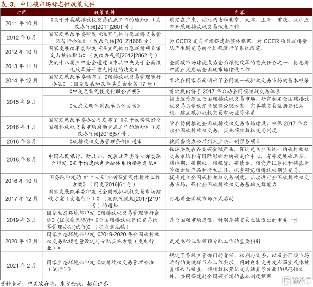 我国全国性碳交易市场即将落地。我国碳交易市场建设从2011年开始,今年我国全国碳交易市场即将落地。根据我国近期发布的《碳排放权交易管理办法(试行)》以及此前的系列文件,减排范围方面,我国目前纳入减排范围仅为电力行业,十三五提出8大行业最迟不超过2022年将会全部纳入碳市场,但进度会有所差别。预计钢铁、石化、化工、建材(水泥)比较先纳入;造纸、航空、有色滞后一些。碳配额发放机制方面,由生态环境部统一确定碳排放总额与分配方案,省级生态环境部主管部门负责根据碳排放额总量与分配方案向本行政区域内的重点排放单位分配规定年度的碳排放配额。碳配额以免费发放为主,预计采用基准线法进行分配。交易标的方面,主要以配额与CCER现货为主。基础设施方面,我国确定在上海建立全国碳排放交易系统,在湖北建立全国碳排放权注册登记中心,分别负责碳排放权的交易与登记结算。