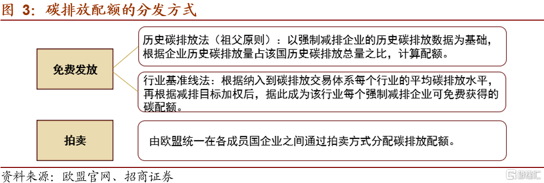 EU ETS的碳排放配额分配方式主要分为两类,一类是免费发放,另一类是拍卖。其中,免费发放的方法又可以分为历史碳排放法和基准线法。