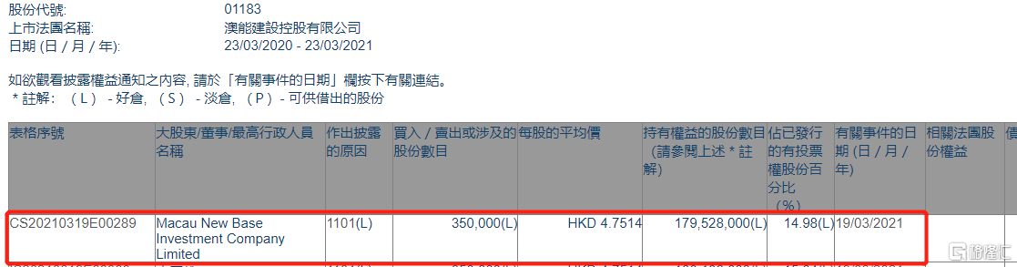 格隆汇APP获悉,根据联交所最新权益披露资料显示,2021年3月19日,澳能建设(01183.HK)获Macau New Base Investment Company Limited在场内以每股均价4.7514港元增持35万股,涉资约166.3万港元。
