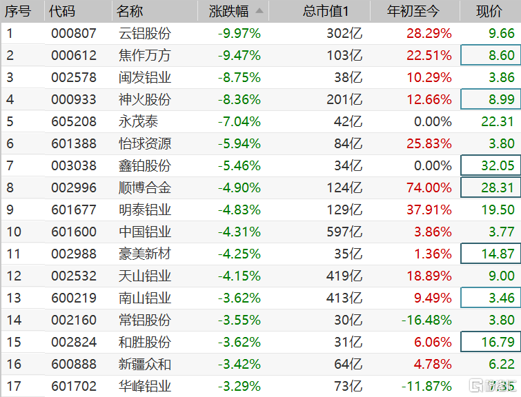 抛储传闻促铝业股再度集体大跌 多股触及跌停
