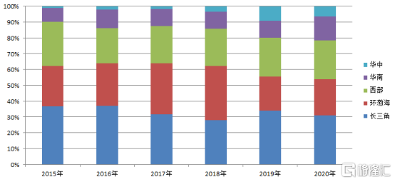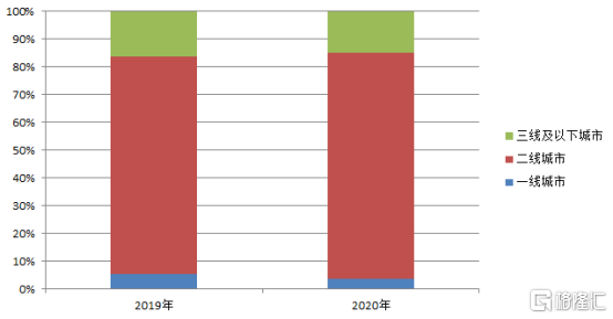 按地区分析,2020年龙湖集团在环渤海地区、西部地区、长三角地区、华南地区及华中地区的新增面积分别占新增收购土地储备总建筑面积的32.5%、24.5%、17.5%、15.3%及10.2%。其中,公司在去年首入唐山、三亚、兰州等8城。截至2020年末,龙湖集团业务已遍布5个城市群的63个城市,其中约90%的货量集中在高能级城市的价值区域,且成本合理,也为盈利的持续增长奠定基础。