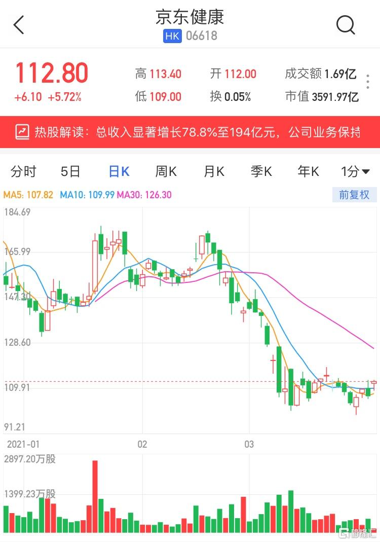 格隆汇3月30日丨京东健康(6618.HK)现报112.8港元,涨5.72%,暂成交1亿港元,最新总市值3591.9亿港元。京东健康昨日晚间发布2020年度业绩称,面对严峻的经济形势和激烈的行业竞争,2020年公司业务依旧保持强劲增长。期内,集团的总收入为194亿元(人民币,下同),同比显著增长78.8%。2020年的平台活跃用户数增至8,980万,相比2019年净增加3,370万,成为集团业务的主要增长驱动力。平台的日均问诊量超过10万,是2019年同期的5倍多。年度非国际财务报告准则盈利7.489亿元,同比增长117.7%。集团总收入的增长主要是由于销售医药和健康产品所得商品收入由2019年的94亿元增加77.8%至2020年的168亿元。