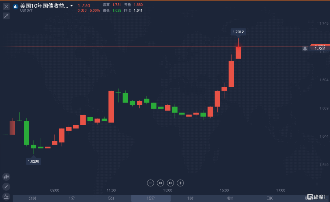 3月18日,美国10年期国债收益率出现短线跳升,站上1.7%关口,最高触及1.73%,为去年1月以来首次。