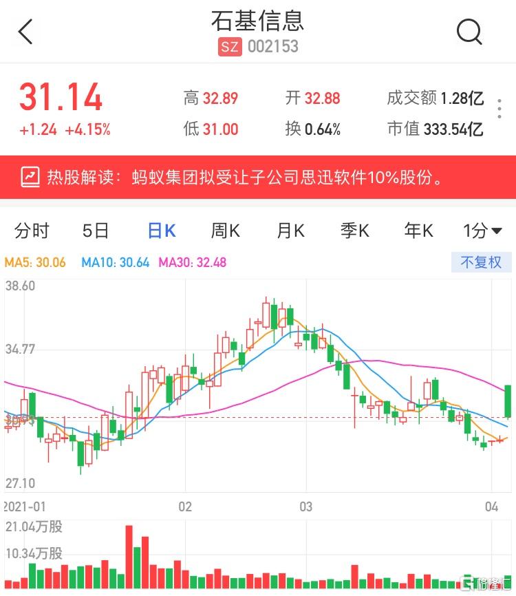 A股异动 | 石基信息(002153.SZ)涨超4% 蚂蚁集团拟受让子公司思迅软件10%股份