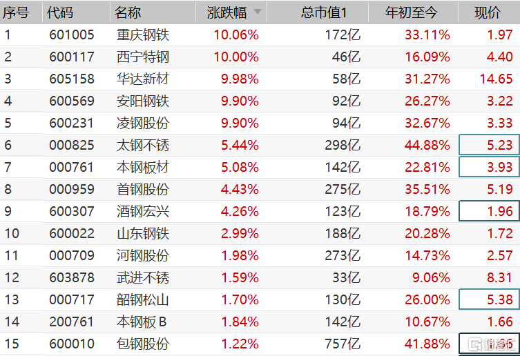 格隆汇4月8日丨钢铁股延续昨日强势,今日再度集体走强,重庆钢铁、西宁特钢、华达新材、安阳钢铁、凌钢股份涨停,首钢股份、酒钢宏兴、太钢不锈等均有不错涨幅。国泰君安最新表示, 压减粗钢产量政策大概率严格执行,行业或迎来供需缺口。另外,全球复苏背景下,美国钢价大幅上涨,国内钢材需求良好,钢铁行业将出现供需缺口。长期看,行业二十年产能扩张大周期基本结束,钢铁行业正站在新繁荣的起点,板块迎来重要投资机会。