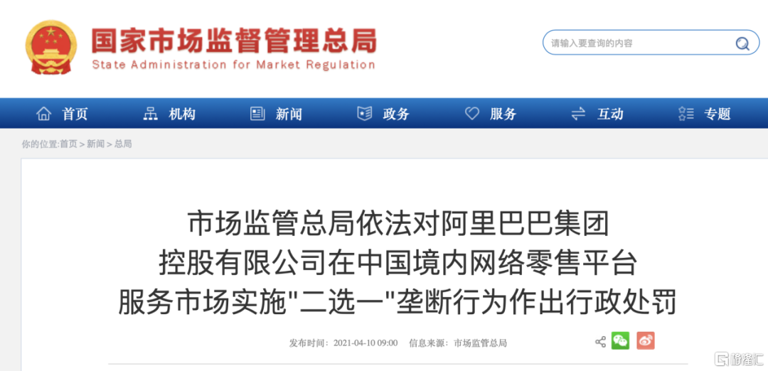 2021年4月10日 09:39阿里巴巴集团被罚182.28亿元