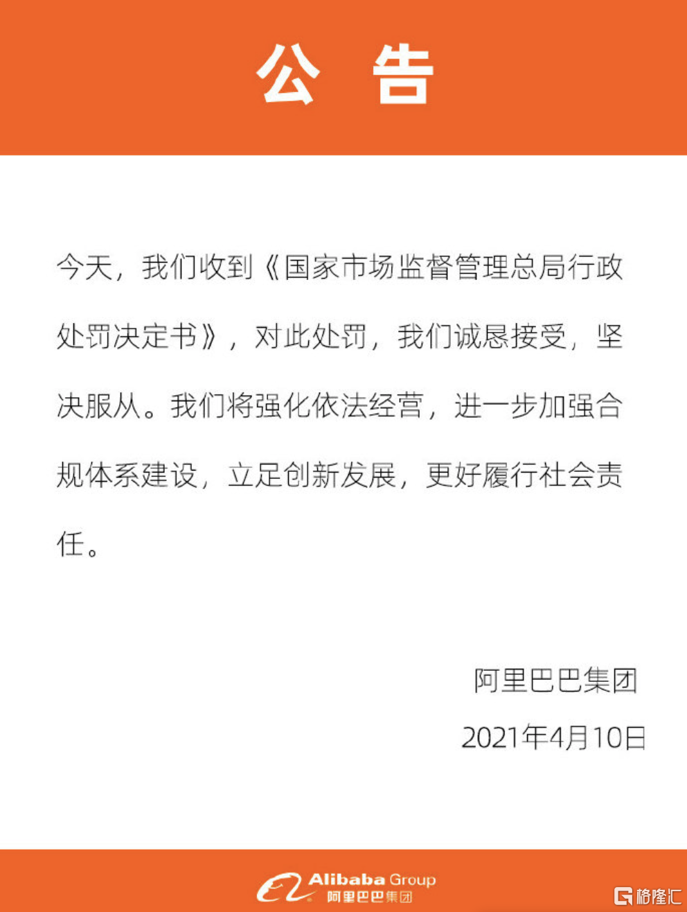 2021年4月10日 09:45阿里巴巴回应被罚:坚决服从