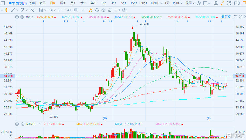 格隆汇4月19日丨中车时代电气(3898.HK)涨幅扩大至8.92%,报34.2港元,暂成交2.32亿港元,总市值402亿港元。第一上海日前称,公司近年来重点开拓传感器、半导体、信号、汽车电控、工业变流等领新域作为新的业务增长点。公司董事会在2020年9月30日批准了建议在科创板上市的议案,并提交了招股书材料。目前估值水平处于历史低位,该行给予公司2021年15倍的市盈率估值,12个月目标价42.4港元,维持买入评级。根据公司去年业绩数字,大摩下调今明年盈测分别9%及7%,仍给予高达43港元的目标价,评级“增持”。