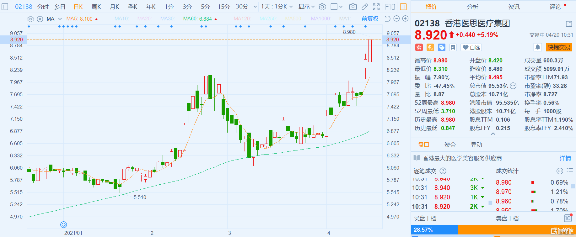 格隆汇4月20日丨香港医思医疗集团(2138.HK)高开高走,现涨幅扩大至逾5%,报8.92港元,高见8.98港元再创历史新高,总市值96亿港元。