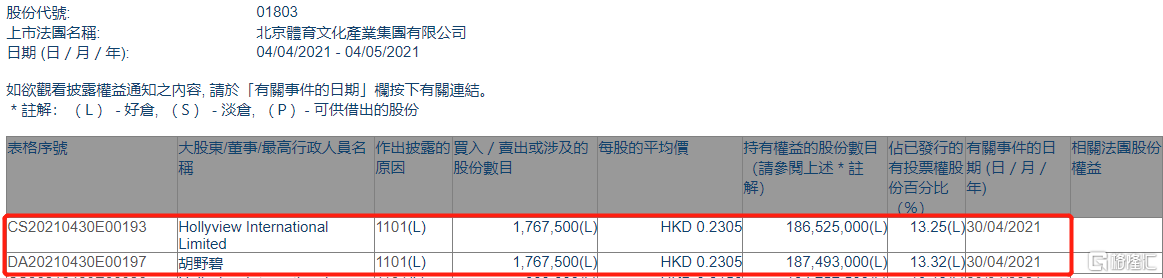 北京體育文化(01803.HK)獲非執行董事胡野碧增持176.75萬股