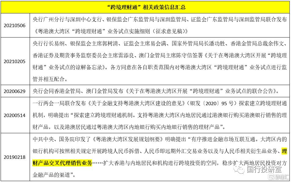4、跨境理财通只是着力于销售端与投资端,并不涉及发行端。其中销售端与投资端聚焦于湾区内的银行与投资者,但湾区外的机构发行的理财产品、公募基金产品则可以通过湾湾区内的机构进行代销来实现跨境布局。