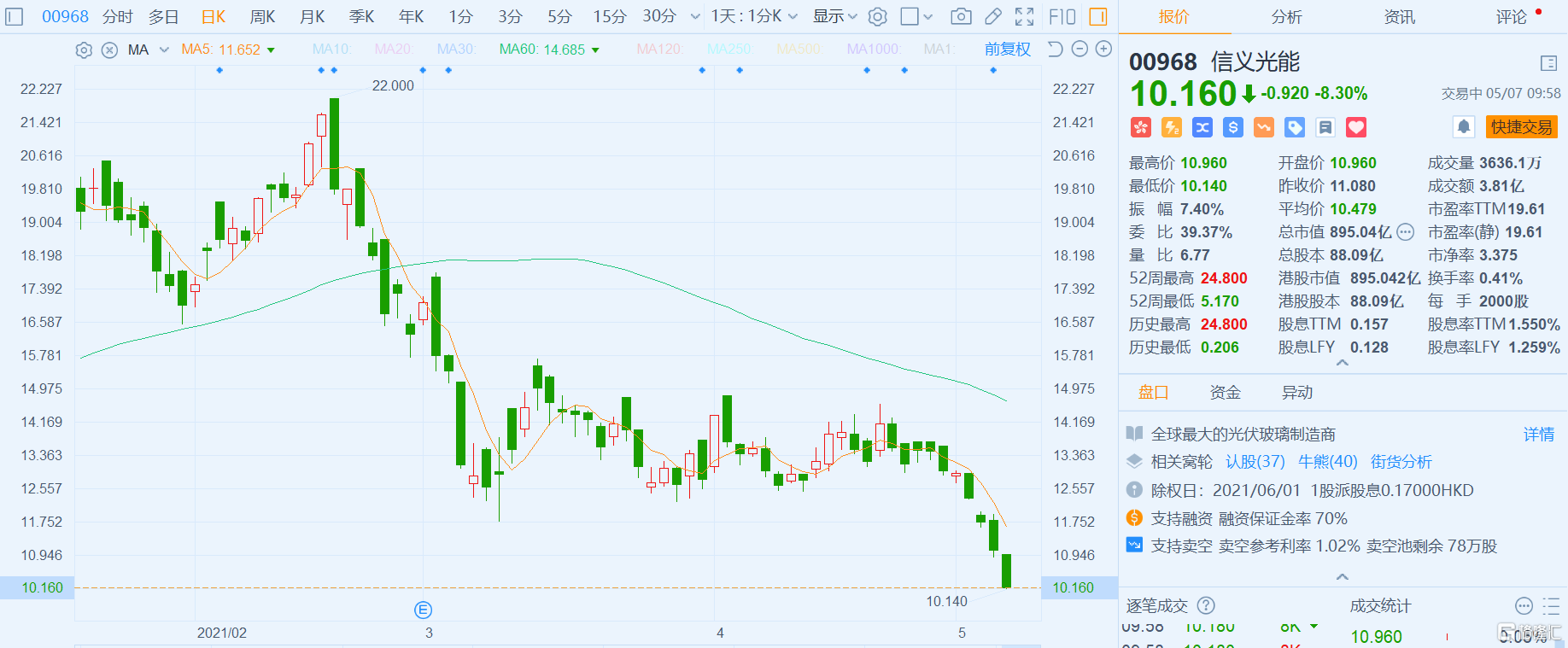 格隆汇5月7日丨信义光能(0968.HK)跌逾8%,暂录七连跌,报10.16港元,股价创去年9月份以来新低,相较于今年1月初创下的历史高点24.8港元,股价已经累计跌去逾59%,最新总市值895亿港元。花旗发布最新研究报告,将信义光能目标价由15港元降23.3%至11.5港元, 重申“中性”评级。该行下调公司2021-23年净利润预测18%至51%,以反映光伏玻璃售价下降。目前2021年预测市盈率19.4倍及市帐率3.5倍,高于历史平均水平54%及35%。瑞信降信义光能目标价至19港元,维持跑赢大市评级;大和则将其目标价降至11.5港元。