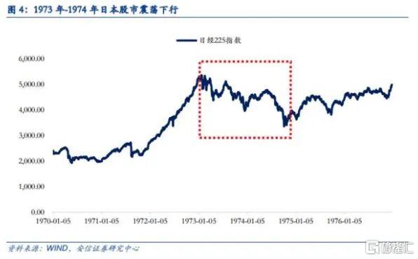 1973年初到1974年底快两年的时间内,美股大跌四成,这段时间SP500的P/E也大幅下降,从18到8附近,虽然EPS仍然保持增长,但是受通胀和实际利润率影响,市场整体估值处于历史低位。日本股市也同样一直震荡下跌,同样跌足两年。
