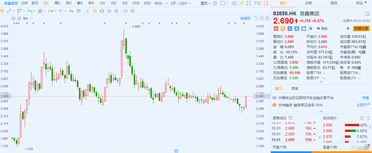 港股异动 | 易鑫集团(2858.HK)涨超8% 一季度汽车融资交易同比增129%