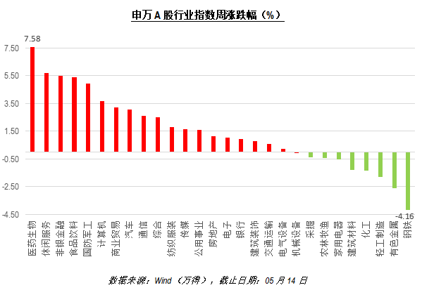 上周,申万一级行业整体表现喜人,板块轮动仍较为明显。其中,此前调整幅度较大的医药板块取得了7.58%的周收益。而此前涨幅亮眼的钢铁、有色金属板块则现回调。