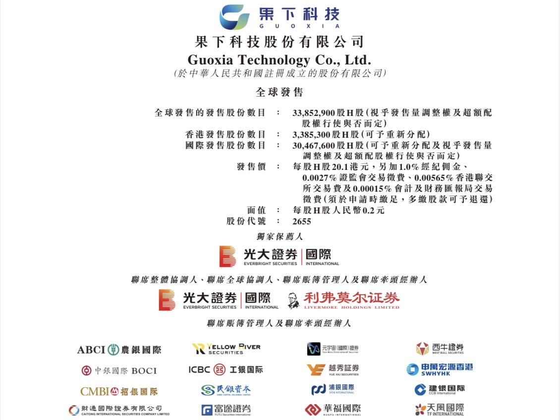 Guoxia Technology Co., Ltd. (02655.HK) has launched its Hong Kong IPO, with the subscription period running from December 8th to December 11th. The company plans a global offering of approximately 33,852,900 H shares, including a 15% over-allotment option. The offer price is set at HK$20.10 per share, with a board lot of 100 shares, requiring a minimum subscription of approximately HK$2,030.26. Trading on the Main Board of the Stock Exchange of Hong Kong is expected to commence on December 16th. Everbright Securities International is the sole sponsor.