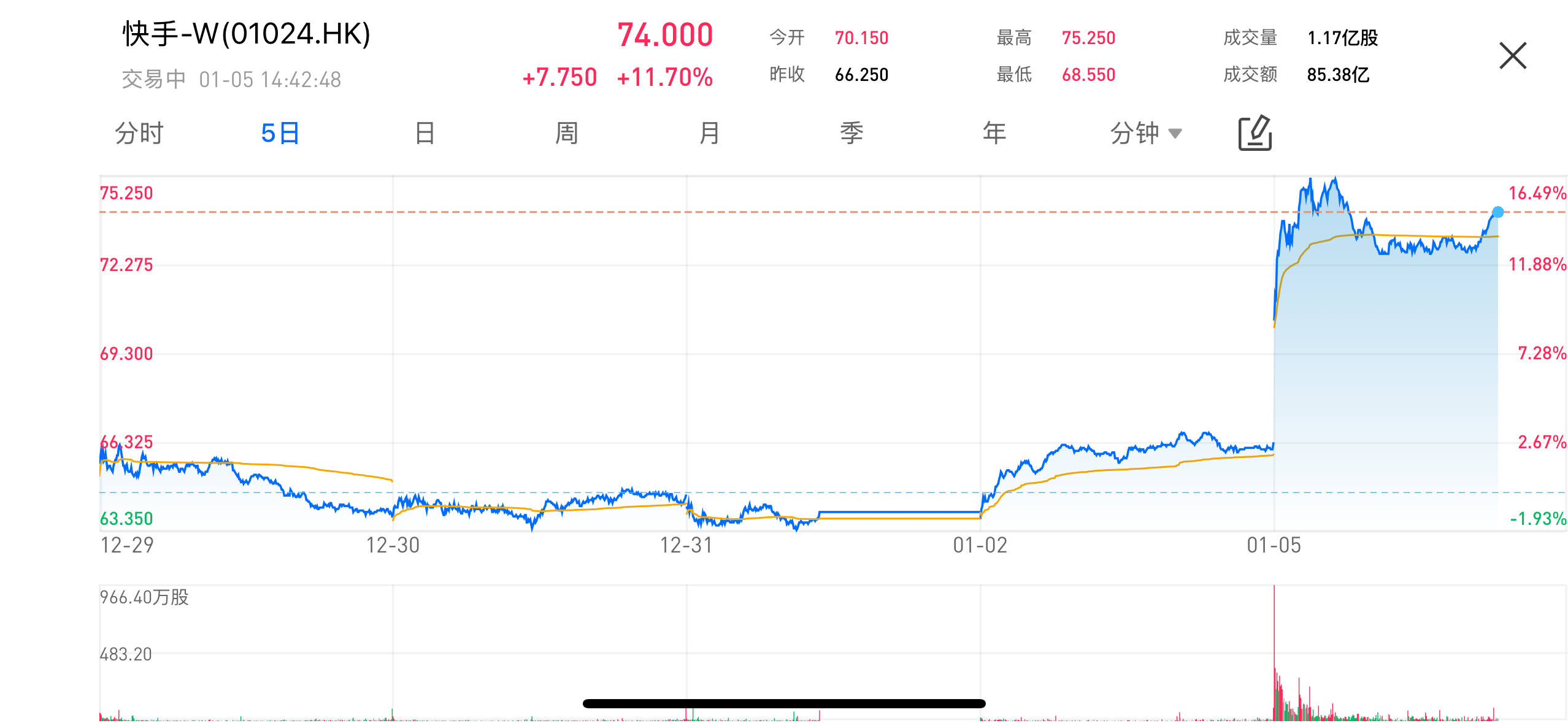 January 5, 2026 — Kuaishou-W (01024.HK) recorded a sharp rally on Monday, with its share price jumping 11.70% to HK$74, marking a recent high. The strong market performance was driven by the company’s successful expansion in overseas markets, particularly the growing global adoption of its artificial intelligence (AI) technology.