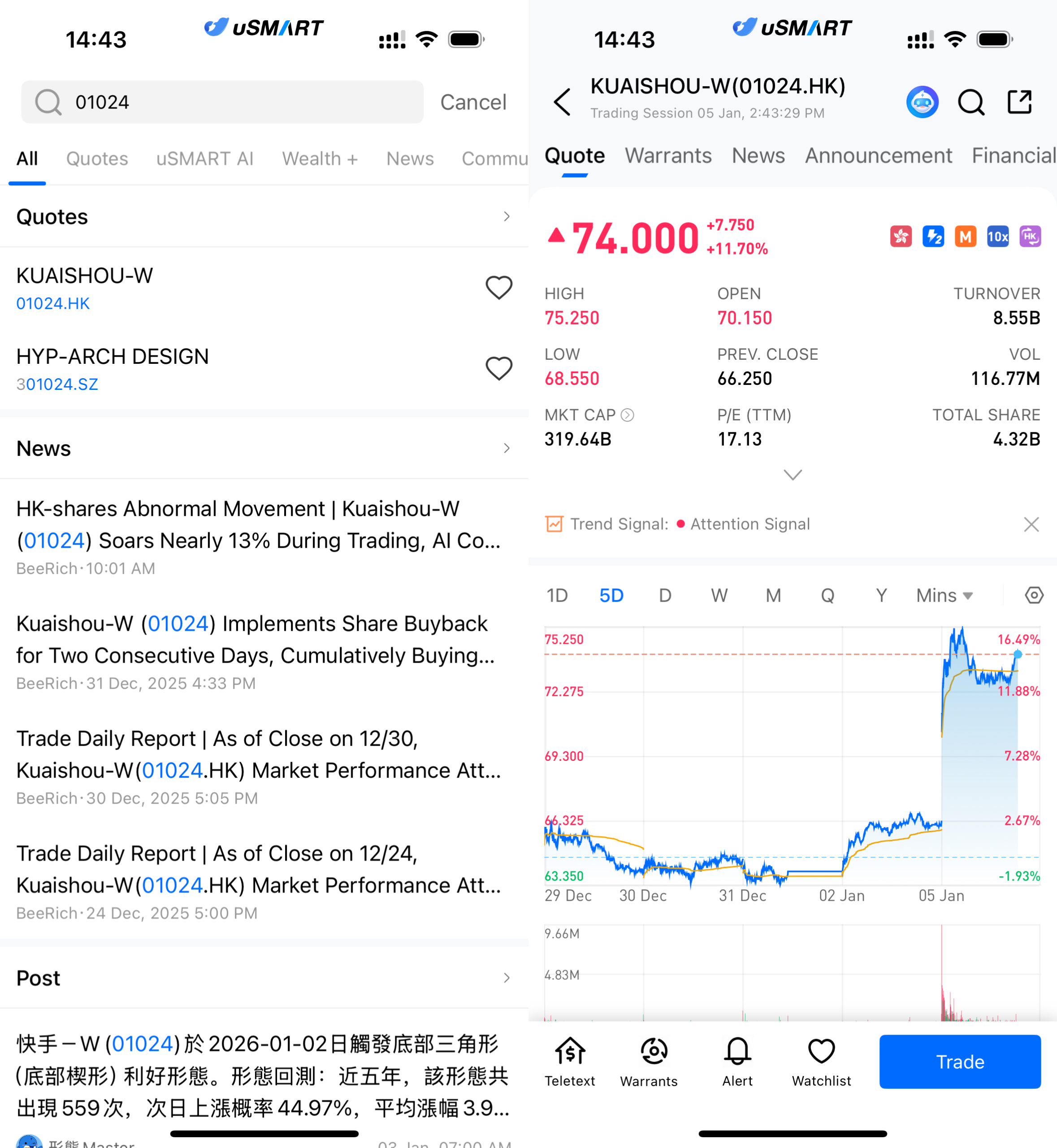 After logging into the uSMART HK app, click the “Search” button in the top-right corner of the page, enter the ticker code (01024.HK), and navigate to the details page to view transaction details and historical trends. Click the “Trade” button in the bottom-right corner, select the trade type, and submit your order after filling in the transaction conditions.