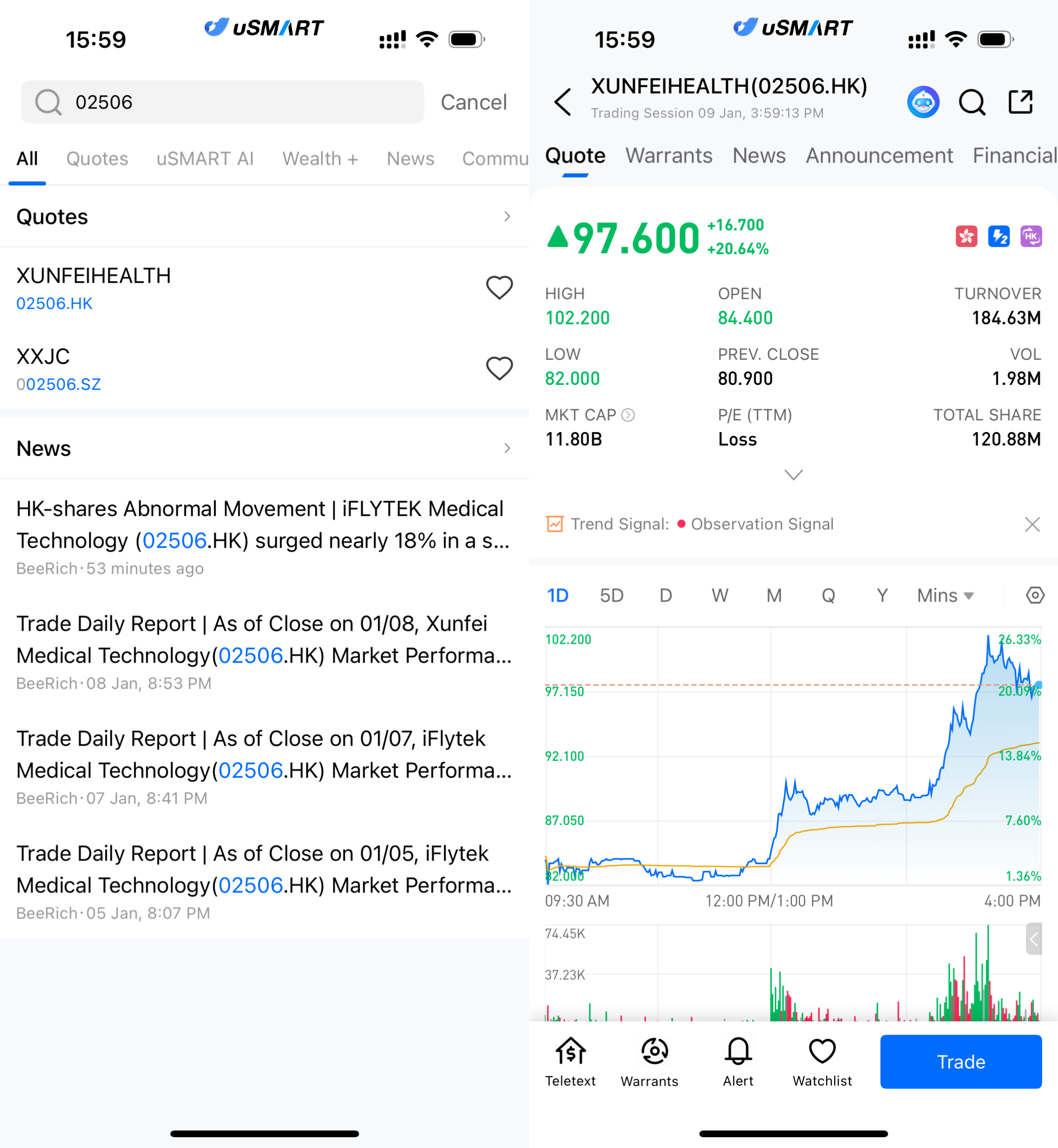 After logging into the uSMART HK app, click the “Search” button in the top-right corner of the page, enter the ticker code (02506.HK), and navigate to the details page to view transaction details and historical trends. Click the “Trade” button in the bottom-right corner, select the trade type, and submit your order after filling in the transaction conditions.