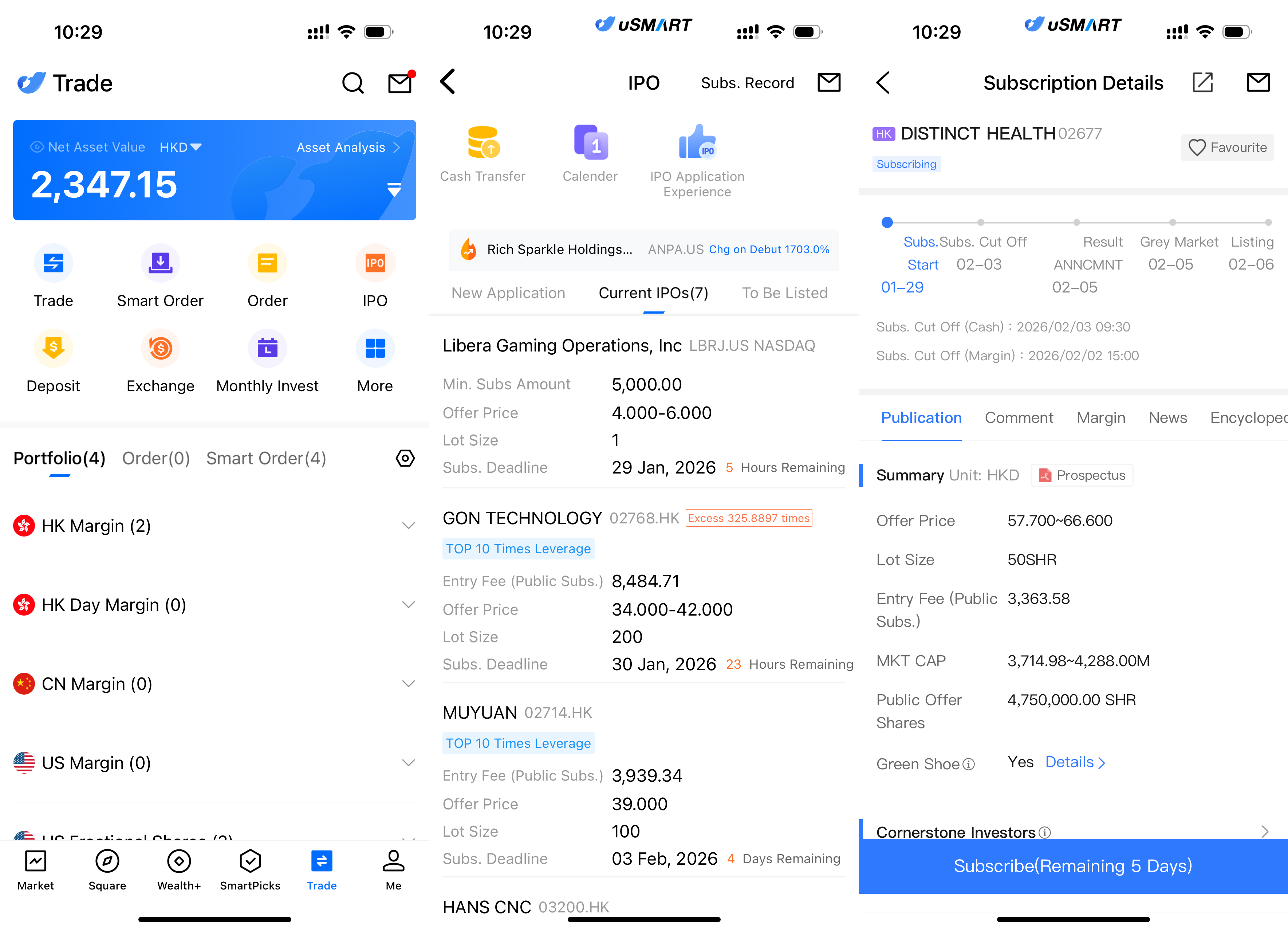 The uSMART HK App features an IPO Centre with exclusive perks, allowing clients to subscribe instantly to public offerings. After logging into the app, tap "Trade" at the bottom-right, go to "IPO Subscription," select Distinct Healthcare, tap "Public Offer," enter your subscription quantity, and submit your order.
