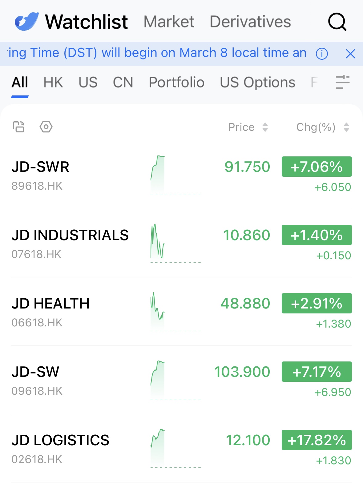 In early trading on the Hong Kong market, JD Group’s latest financial report lifted related stocks across the board. As of press time, $JD.com-SW (09618.HK)$ rose 7.37%, $JD.com-SWR (89618.HK)$ increased 7.12%, $JD Health (06618.HK)$ gained 3.33%, $JD Industrial (07618.HK)$ edged up 1.31%, and $JD Logistics (02618.HK)$ soared as much as 18.11% intraday.