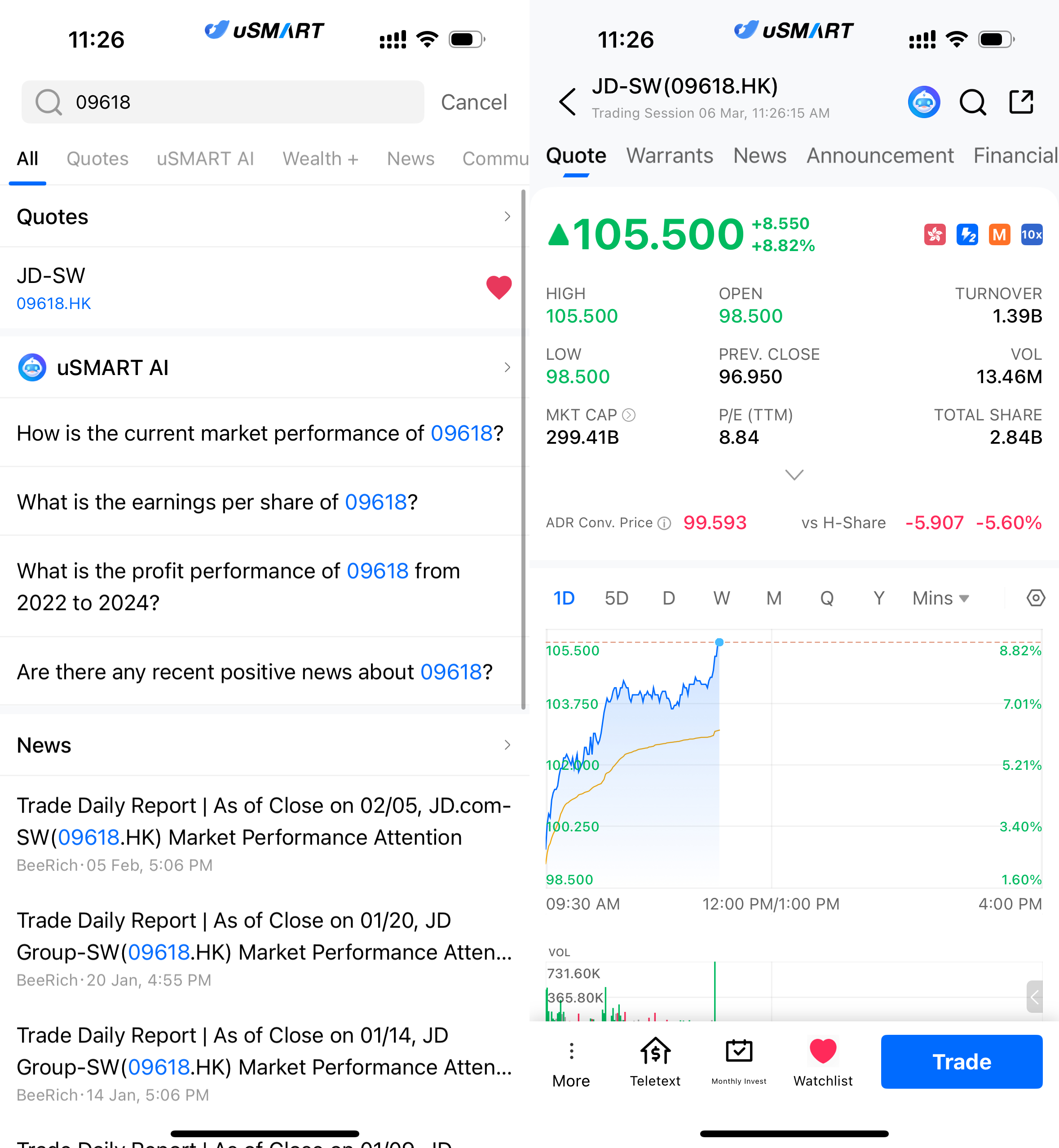 After logging into the uSMART HK app, click the “Search” button in the top-right corner of the page, enter the ticker code (09618.HK), and navigate to the details page to view transaction details and historical trends. Click the “Trade” button in the bottom-right corner, select the trade type, and submit your order after filling in the transaction conditions.