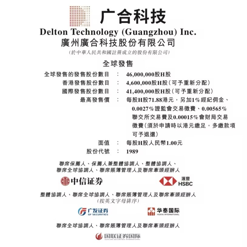 Guangzhou Delton Technology Co., Ltd. (DELTON TECHNOLOGY (GUANGZHOU) INC., stock code: 1989) has launched its Hong Kong IPO. The subscription period is from March 12 to March 17, 2026, with a global offering of 46,000,000 H shares. The offer price is not more than HKD 71.88 per share, with 100 shares per board lot, implying an estimated minimum investment of approximately HKD 7,260.49. The shares are expected to be listed on the Main Board of the Hong Kong Stock Exchange on March 20, 2026. CITIC Securities (Hong Kong) Limited and HSBC Corporate Finance (Hong Kong) Limited are the joint sponsors of the IPO.