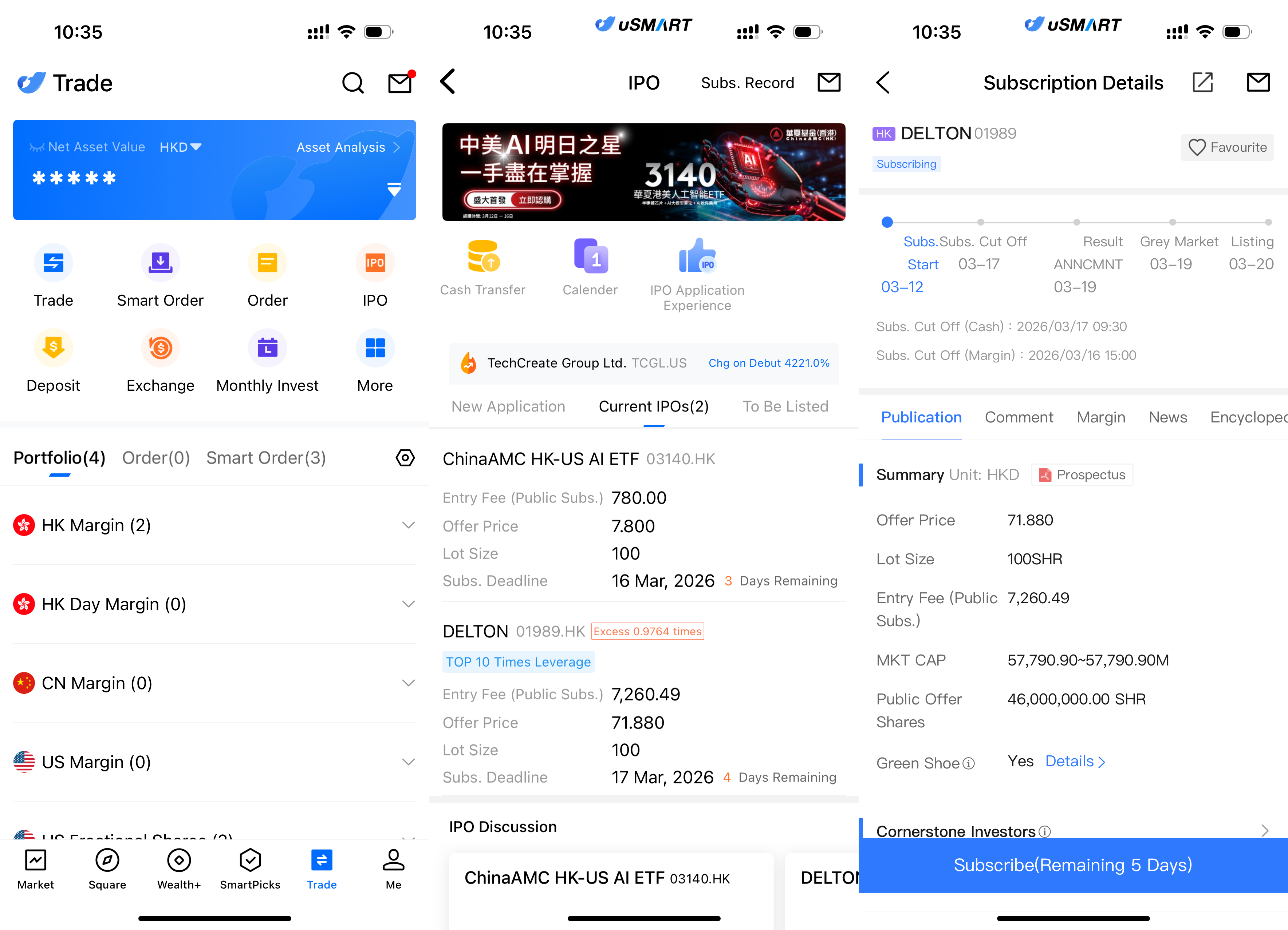 The uSMART HK App features an IPO Centre with exclusive perks, allowing clients to subscribe instantly to public offerings. After logging into the app, tap "Trade" at the bottom-right, go to "IPO Subscription," select Delton Technology, tap "Public Offer," enter your subscription quantity, and submit your order.