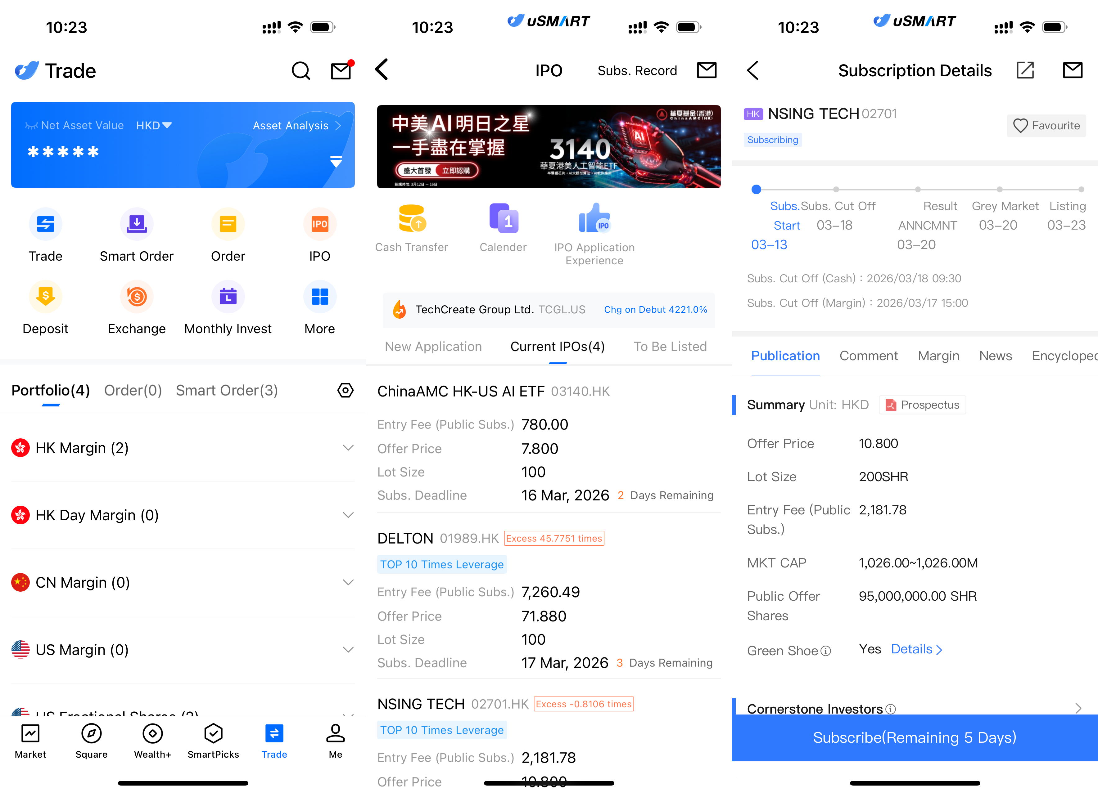 The uSMART HK App features an IPO Centre with exclusive perks, allowing clients to subscribe instantly to public offerings. After logging into the app, tap "Trade" at the bottom-right, go to "IPO Subscription," select NSING Technologies, tap "Public Offer," enter your subscription quantity, and submit your order.
