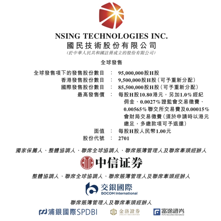 NSING Technologies Inc. (02701.HK) has launched its initial public offering (IPO) in Hong Kong, with the subscription period running from March 13 to March 18, 2026. The company plans a global offer of 95 million H shares at an upper limit price of HKD 10.80 per share. Each board lot consists of 200 shares, with an estimated minimum subscription amount of approximately HKD 2,181.78. The stock is expected to debut on the Main Board on March 23. CITIC Securities (Hong Kong) Limited acts as the sole sponsor of the offering.