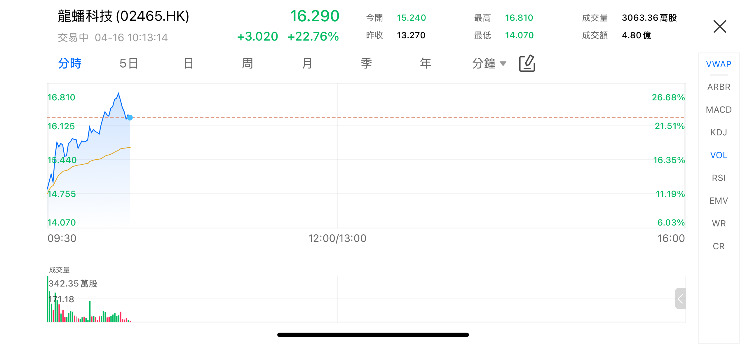 On the morning of April 16, LOPAL TECH (02465.HK) showed significant strength, with intraday gains exceeding 20%. As of press time, the stock was trading at HK$16.29, with a turnover of HK$480 million. Trading volume expanded markedly, reflecting a rapid increase in market attention.