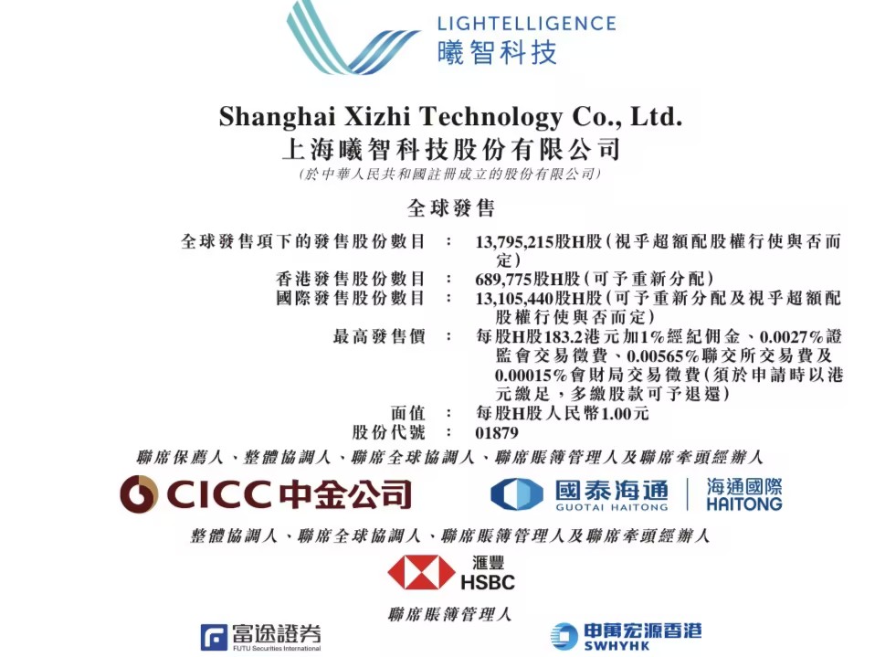 Shanghai Xizhi Technology Co., Ltd. (01879.HK) has launched its Hong Kong IPO, with the offer period running from April 20 to April 23, 2026. The company plans to globally offer 13,795,215 H shares, with a 15% over-allotment option. The offer price range is set between HKD 166.60 and HKD 183.20 per share, with a board lot size of 15 shares and an entry fee of approximately HKD 2,775.71. The shares are expected to be listed on the Main Board of the Hong Kong Exchanges and Clearing Limited on April 28, 2026. China International Capital Corporation and Haitong International Securities Group act as joint sponsors.