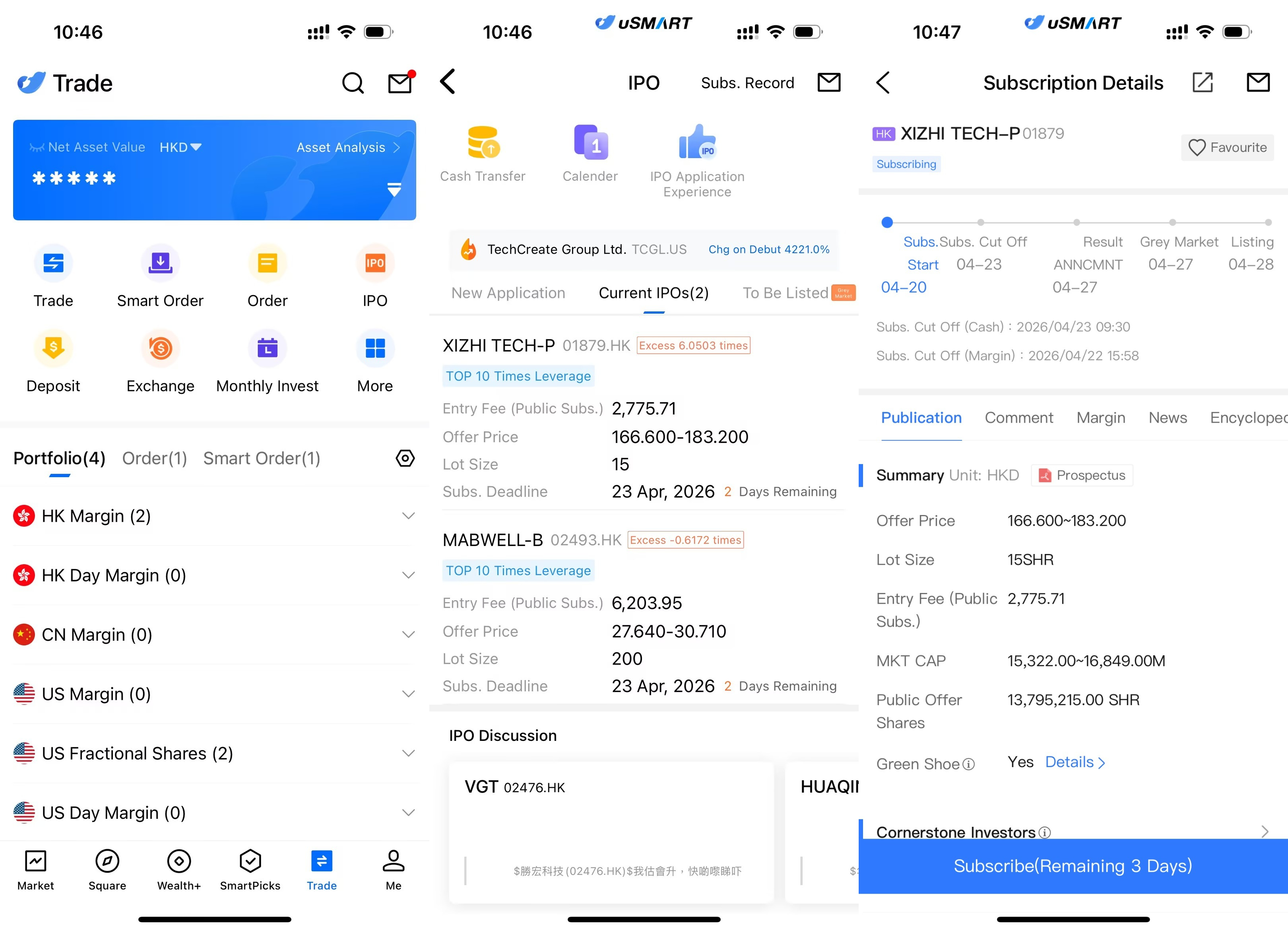 The uSMART HK App features an IPO Centre with exclusive perks, allowing clients to subscribe instantly to public offerings. After logging into the app, tap "Trade" at the bottom-right, go to "IPO Subscription," select Xizhi Technology, tap "Public Offer," enter your subscription quantity, and submit your order.